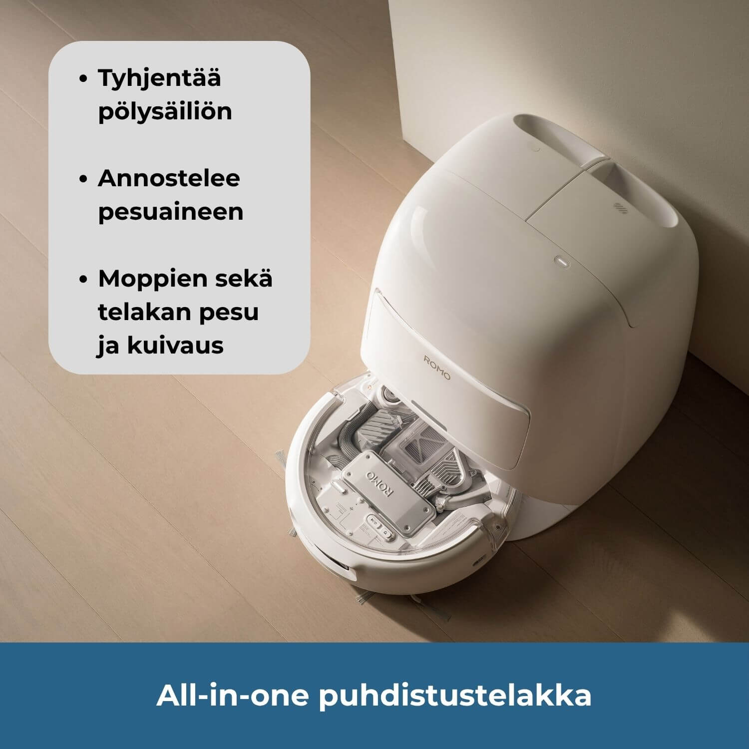 All-in-one–puhdistustelakka – tyhjentää pölysäiliön, annostelee pesuaineen sekä pesee ja kuivaa moppaustyynyt sekä telakan