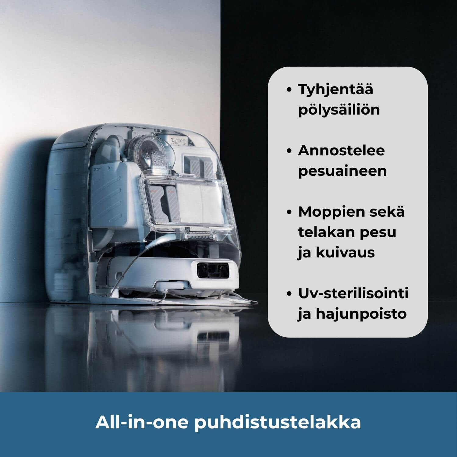 All-in-one–puhdistustelakka – tyhjentää pölysäiliön, annostelee pesuaineen sekä pesee ja kuivaa moppaustyynyt sekä telakan