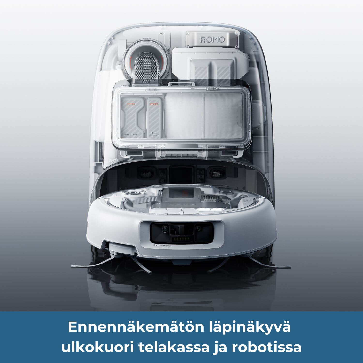 ROMO P kartoittaa tilan tarkasti ja tallentaa myös useamman kerroksen pohjakartat. Iso akku mahdollistaa jopa 3 tunnin siivouksen yhdellä latauksella, joten robotti sopii myös isoihin asuntoihin