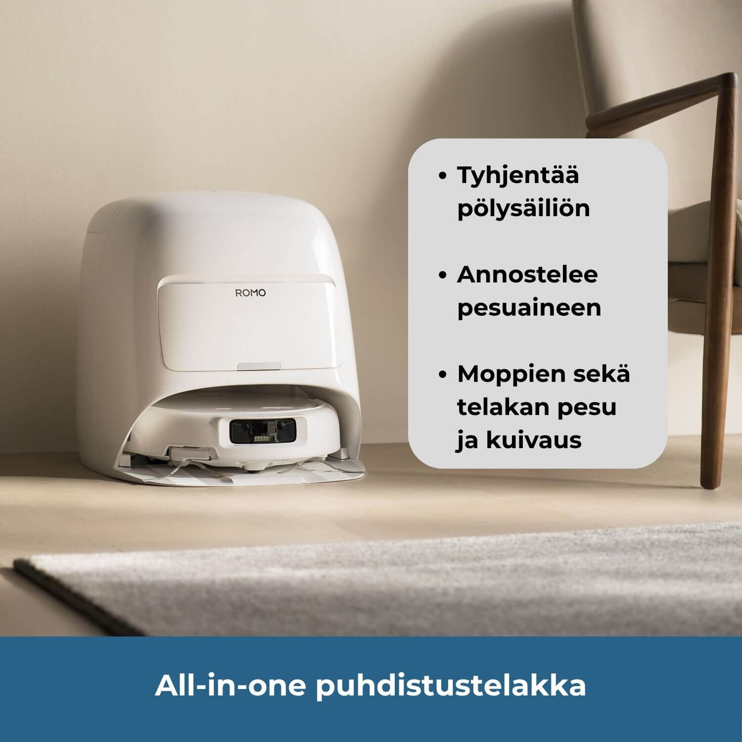 All-in-one–puhdistustelakka – tyhjentää pölysäiliön, annostelee pesuaineen sekä pesee ja kuivaa moppaustyynyt sekä telakan