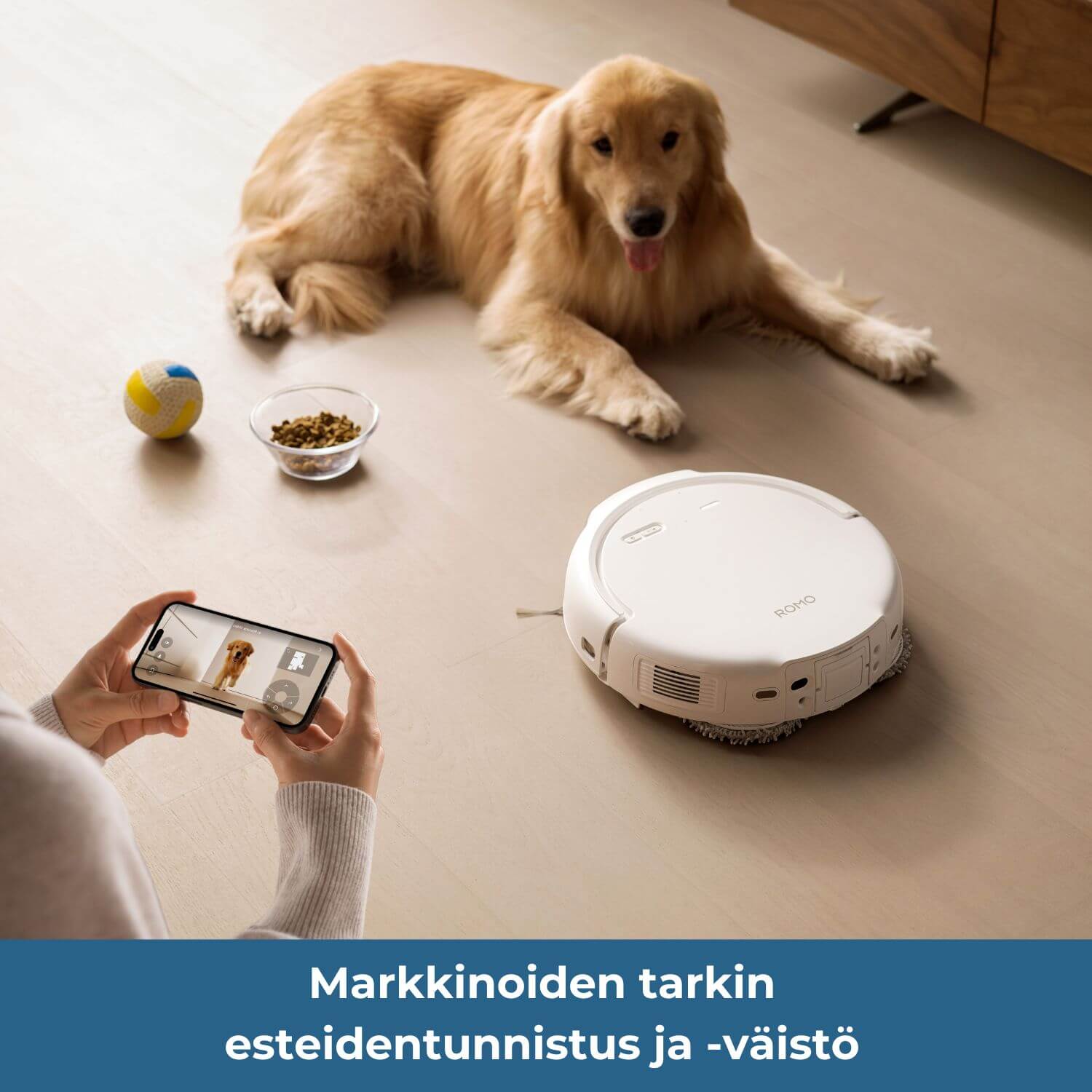 ROMO S väistääkin tarkasti esimerkiksi johdot, sukat, lelut ja nesteroiskeet ilman, että käyttäjän tarvitsee siivota niitä pois tieltä.