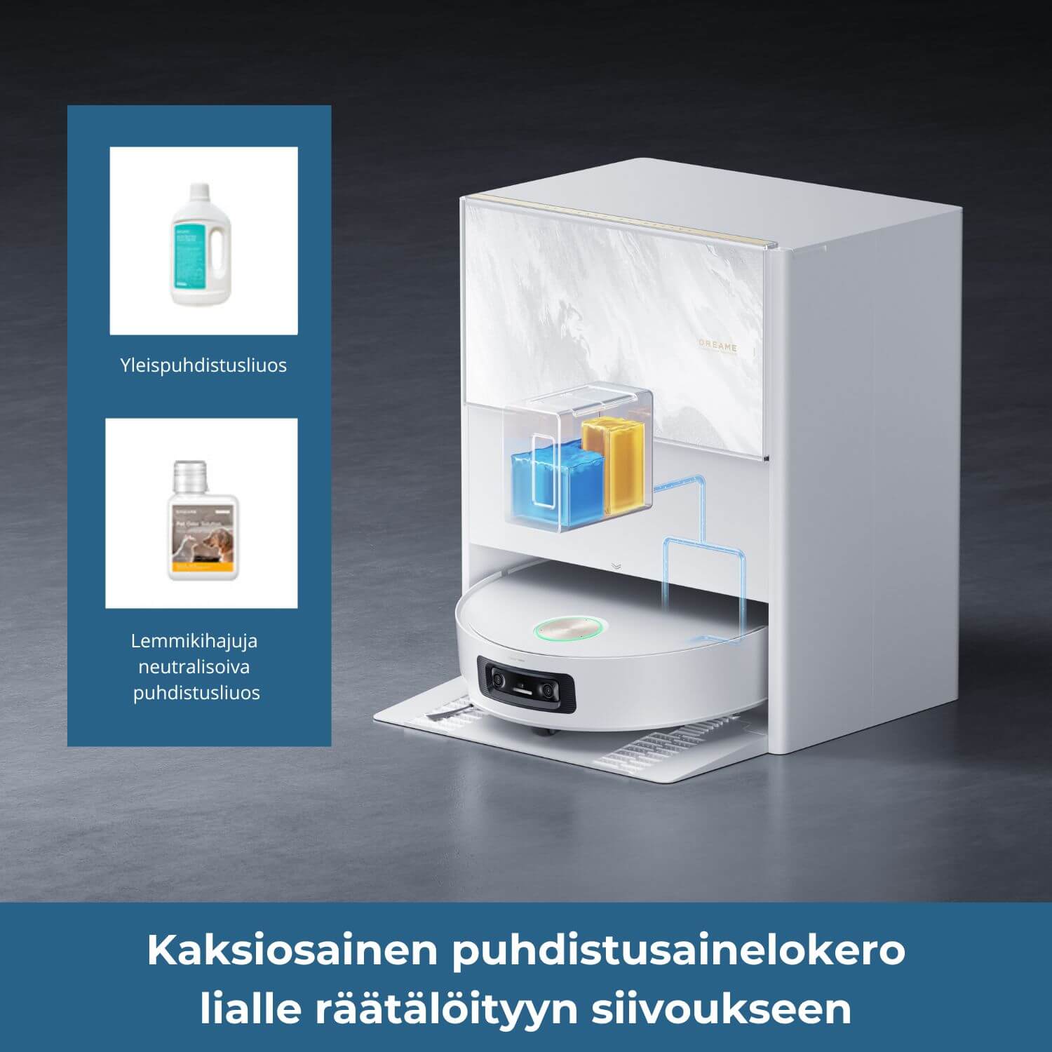 Aqua 10 Ultra Track Completessa on kaksilokeroinen pesuainejärjestelmä. Puhdistustelakka lisää automaattisesti pesuainetta oikeassa suhteessa robotin vesisäiliöön ja valitsee tarpeen mukaan joko Dreame lattianpuhdistusliuoksen tai lemmikkikotiin suunnitellun, hajuja neutraloivan puhdistusliuoksen.