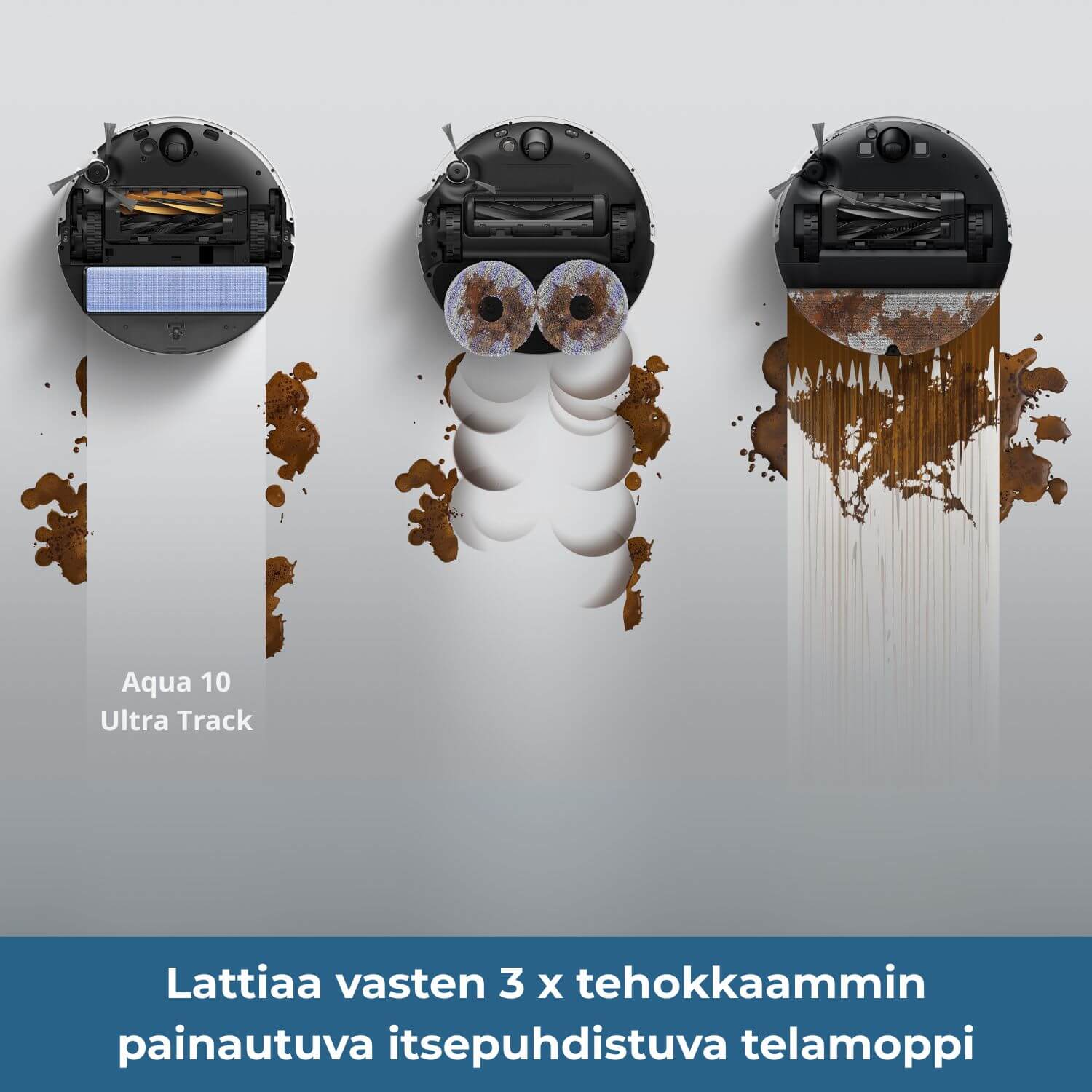 Aqua 10 Ultra Track voi mopata myös hyvin märkiä sotkuja tai esimerkiksi kylpyhuoneen märkää lattiaa, jolloin robotti moppaa kuivalla telalla kuivatakseen lattian samalla.