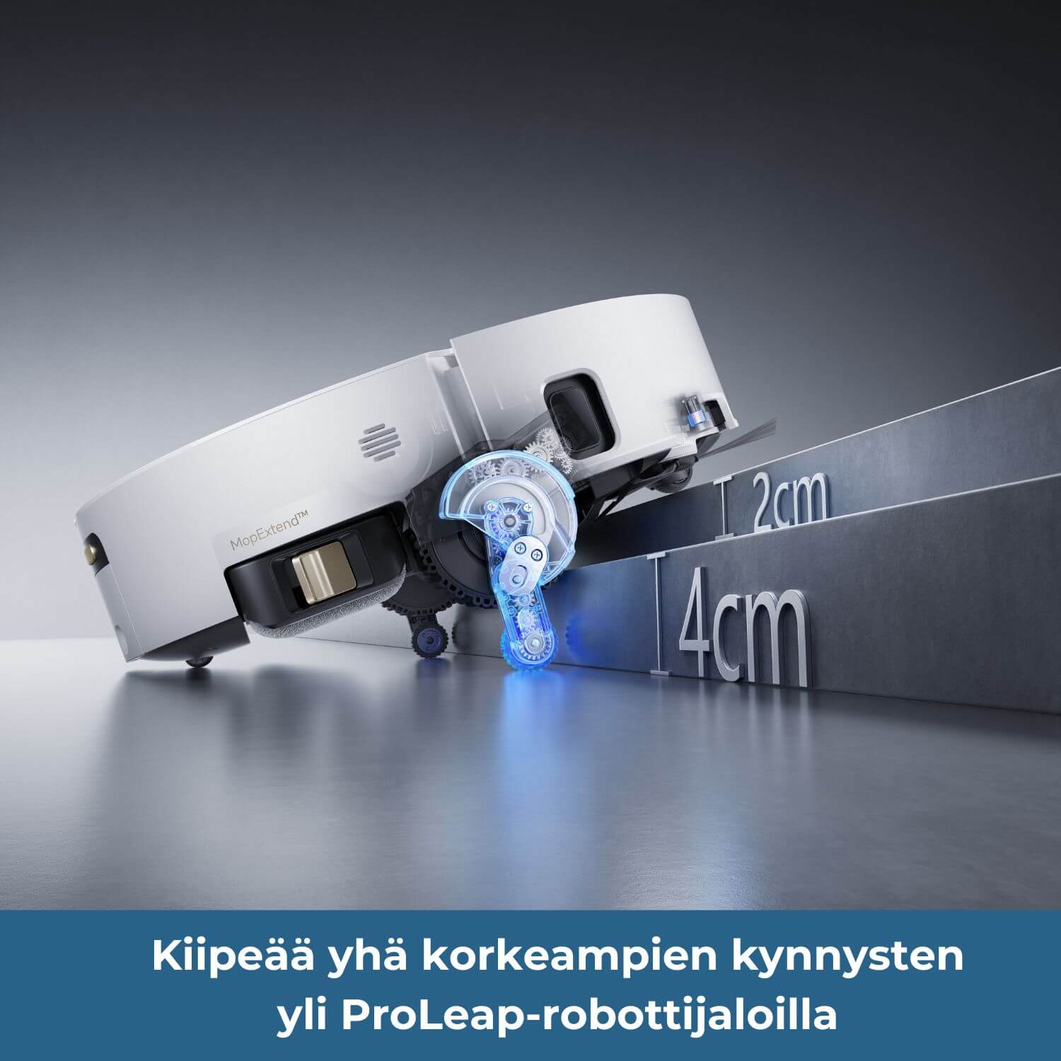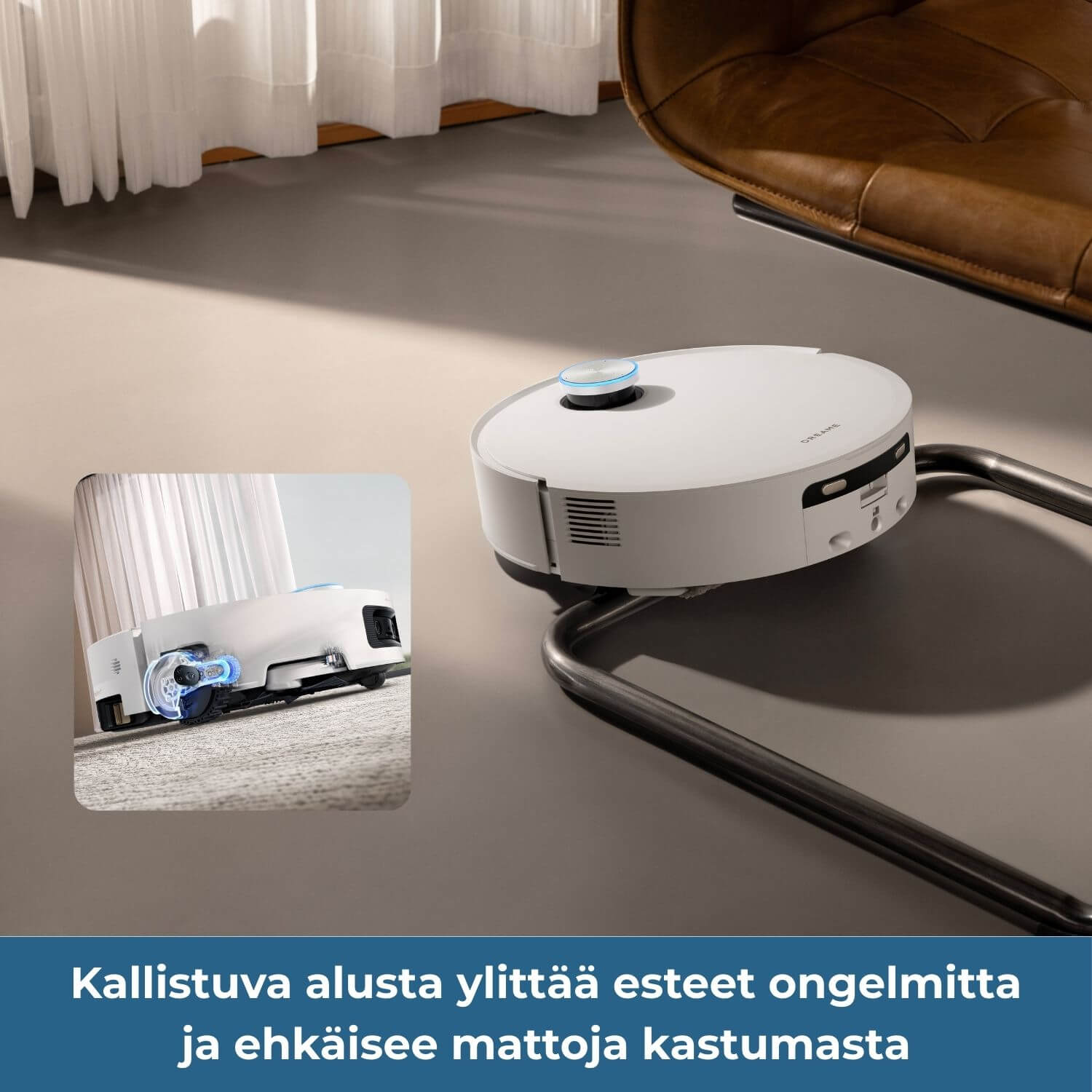 Mattoja imuroidessa robotin alusta kallistuu nostaen telamoppia, jotta mopin kosteus ei kastele mattoja.
