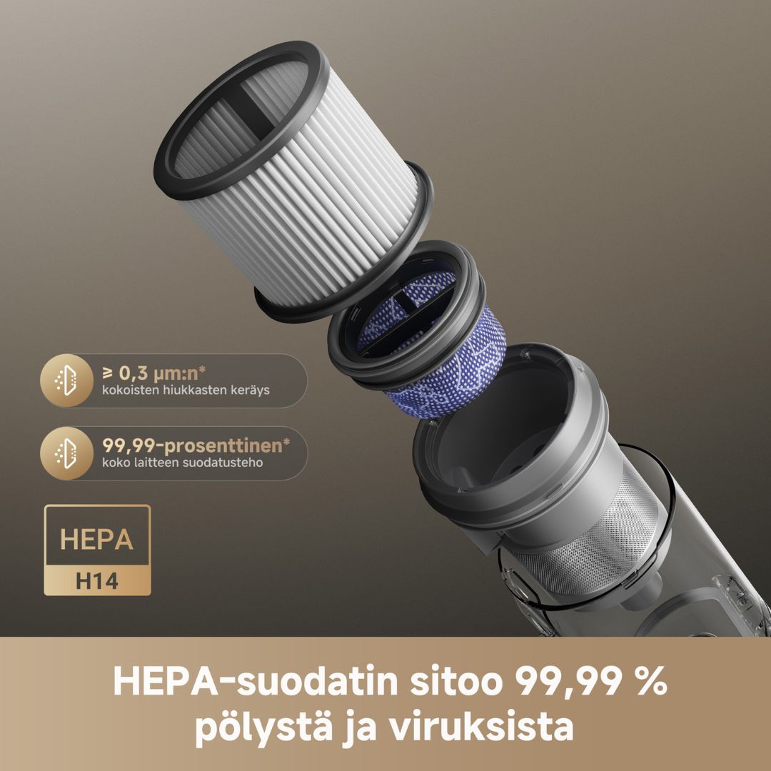 Tehokas monikerroksinen suodatusjärjestelmä suodattaa jopa 99,99 % pienhiukkasista, kuten pölystä ja allergeeneista, pitäen kotisi raikkaana ja puhtaana.