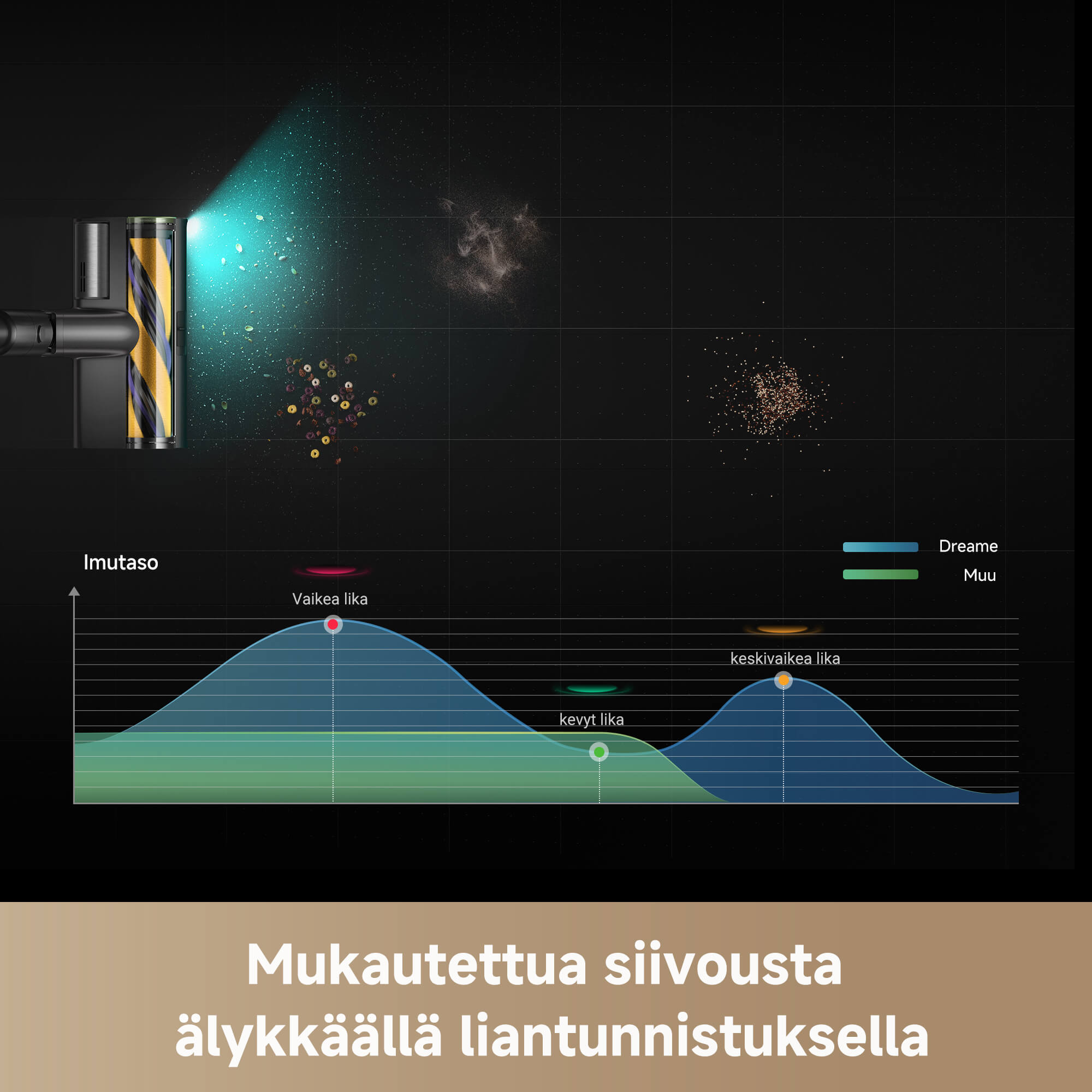 Dreame tunnistaa erilaiset lattiatyypit ja matot ja säätää imutehon automaattisesti imuroitavalle pinnalle sopivaksi. Lisäksi siinä on automaattinen pölyntunnistin, jonka perusteella varsi-imuri osaa säätää imutehoaan. Tämän johdosta laite käyttää tarvittavan verran imutehoa, jolloin akun kesto on pidempi ja laitteen ääni hiljaisempi.