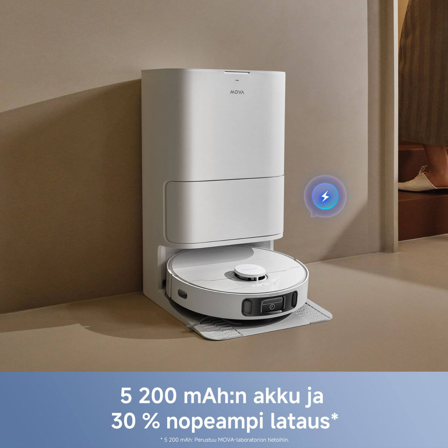 Mova E40 tunnistaa automaattisesti matot ja kasvattaa imutehoa sekä nostaa moppaustyynyt ylös mattojen päällä. Tämän ansiosta robotti voi yhtä aikaa imuroida sekä mopata koko asunnon.