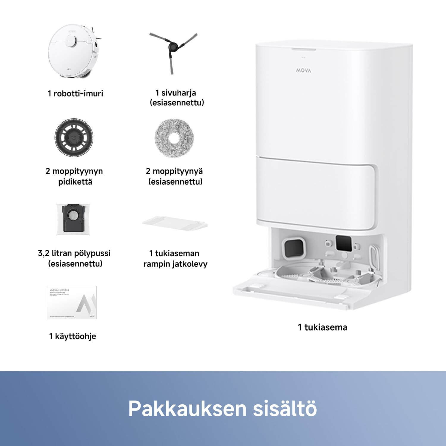 All-in-one–puhdistustelakka - tyhjentää pölysäiliön sekä pesee ja kuivaa moppaustyynyt