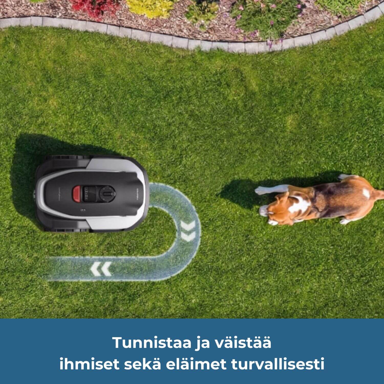 Mobiilisovelluksen avulla voit määrittää virtuaaliset rajat ja luoda kiellettyjä alueita (No-Go zones) esimerkiksi istutusten tai trampoliinien ympärille.