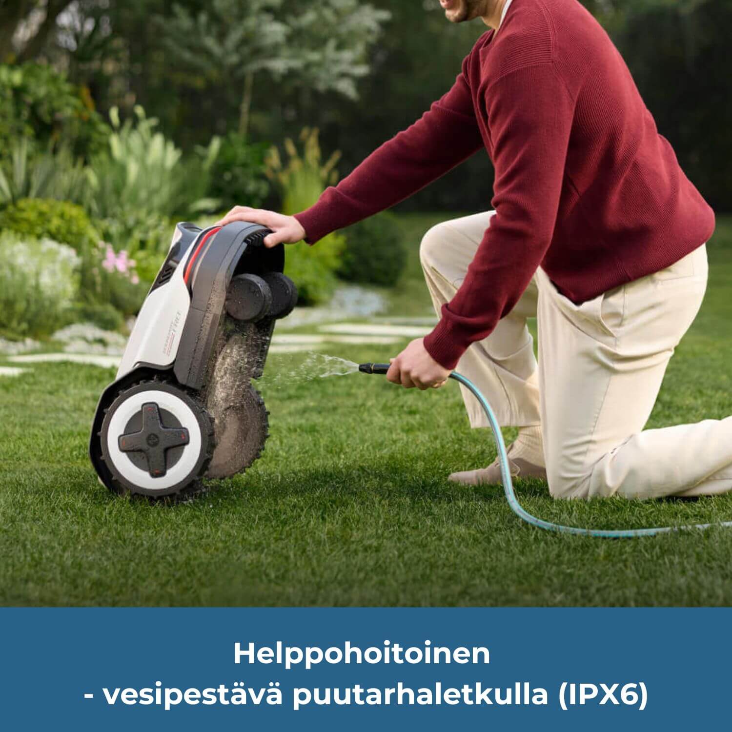 RockNeo on IPX6-luokiteltu, joten se kestää voimakkaita vesisuihkuja. Voit siis puhdistaa leikkurin rungon ja teräalueen helposti suoraan puutarhaletkulla.