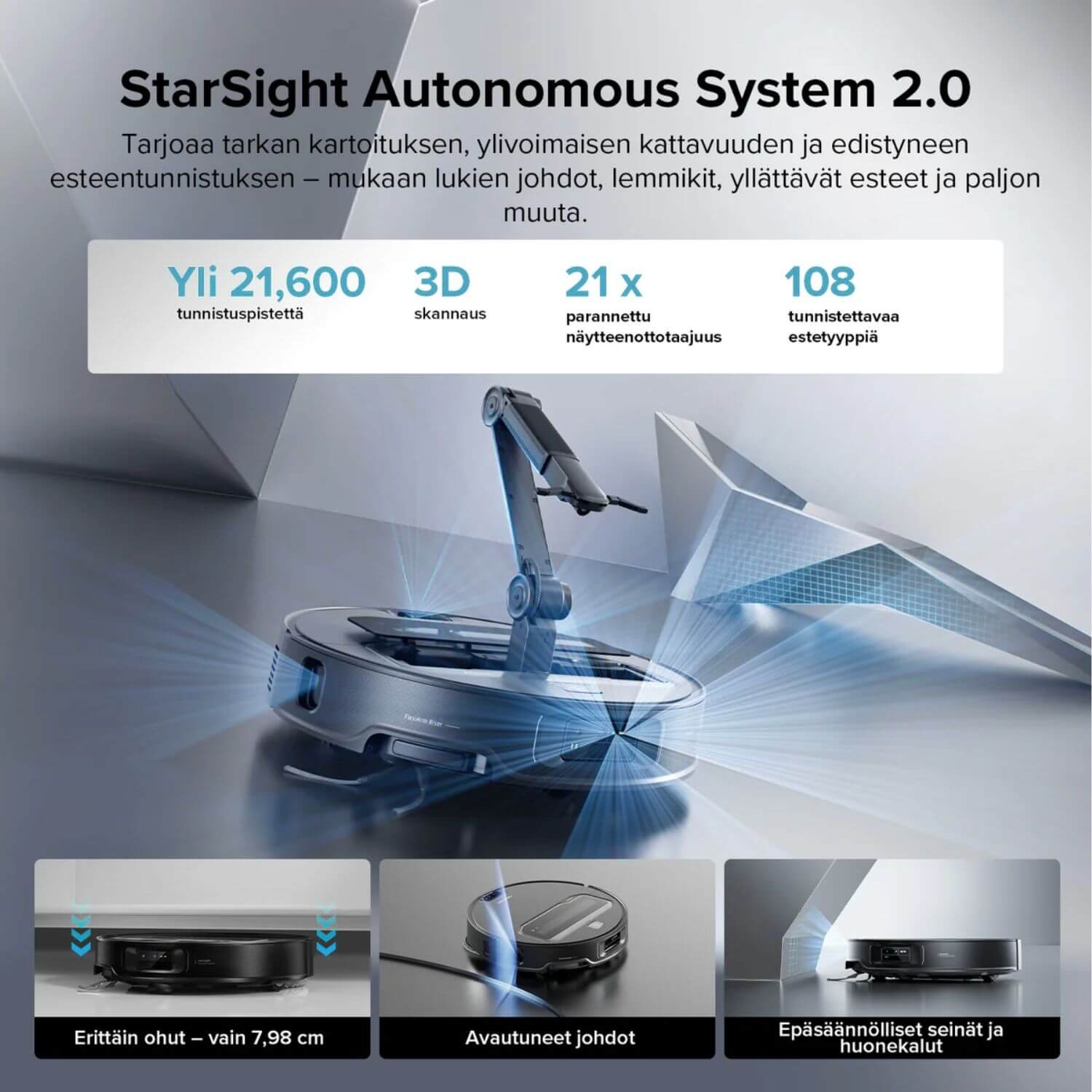 Saros Z70:n StarSight™ 2.0 -esteentunnistus on todettu testeissä olevan robotti-imurien ehdotonta parhaimmistoa. Lisäksi robotissa on VertiBeam-sivutunnistus, joka näkee esineet robotin sivulla.