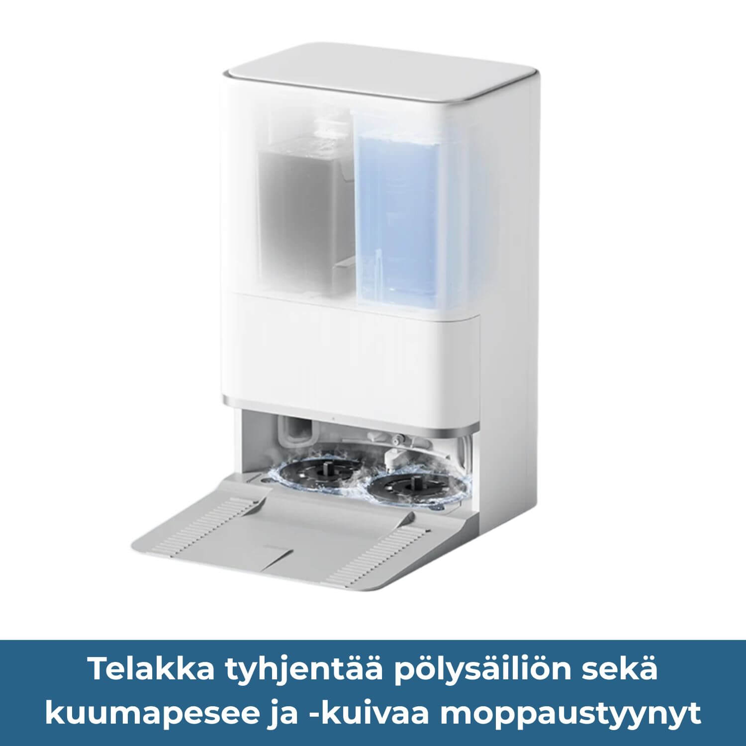 All-in-one–puhdistustelakka - tyhjentää pölysäiliön sekä kuumapesee ja -kuivaa moppaustyynyt sekä telakan