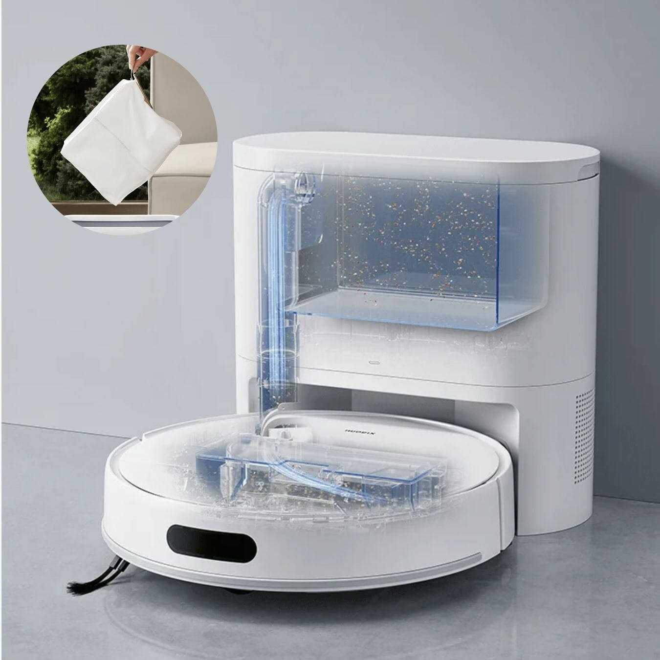 Imuroinnin loputtua Xiaomi tyhjentää robotin oman pölysäiliön tyhjennystelakan pölypussiin. Tyhjennyssäiliö vähentää huomattavasti imurin huoltotarvetta, kun pölysäiliötä ei tarvitse itse tyhjätä jokaisen imurointikerran jälkeen.